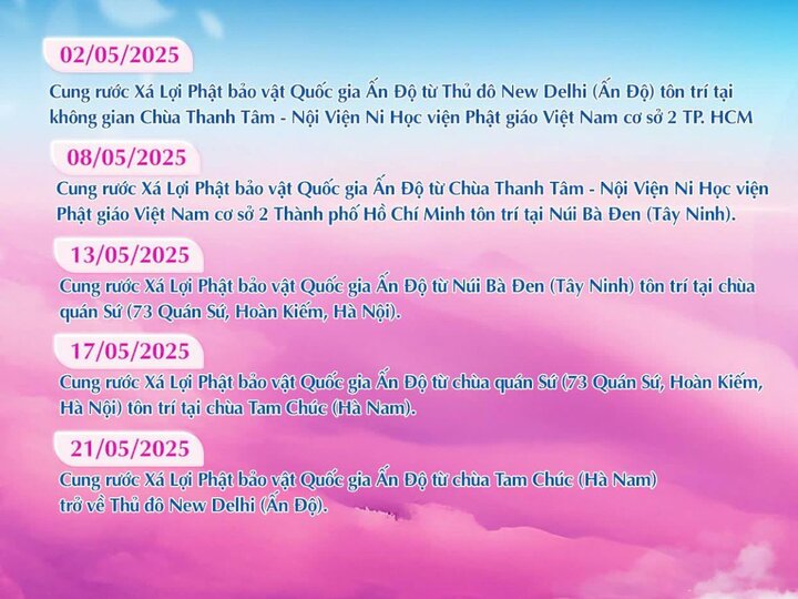 Dịp Lễ Phật Đản Vesak 2025, Chính phủ Ấn Độ đã đồng ý cho phép rước xá lợi Phật quý báu từ viện bảo tàng tại New Delhi về Việt Nam. Đây là sự kiện tâm linh lớn nhất trong năm, thu hút sự quan tâm của hàng triệu Phật tử khắp thế giới. Xá lợi được vận chuyển bằng chuyên cơ đặc biệt, kèm theo đoàn hộ tống gồm các cao tăng và đại diện Phật giáo từ hơn 80 quốc gia trên thế giới.